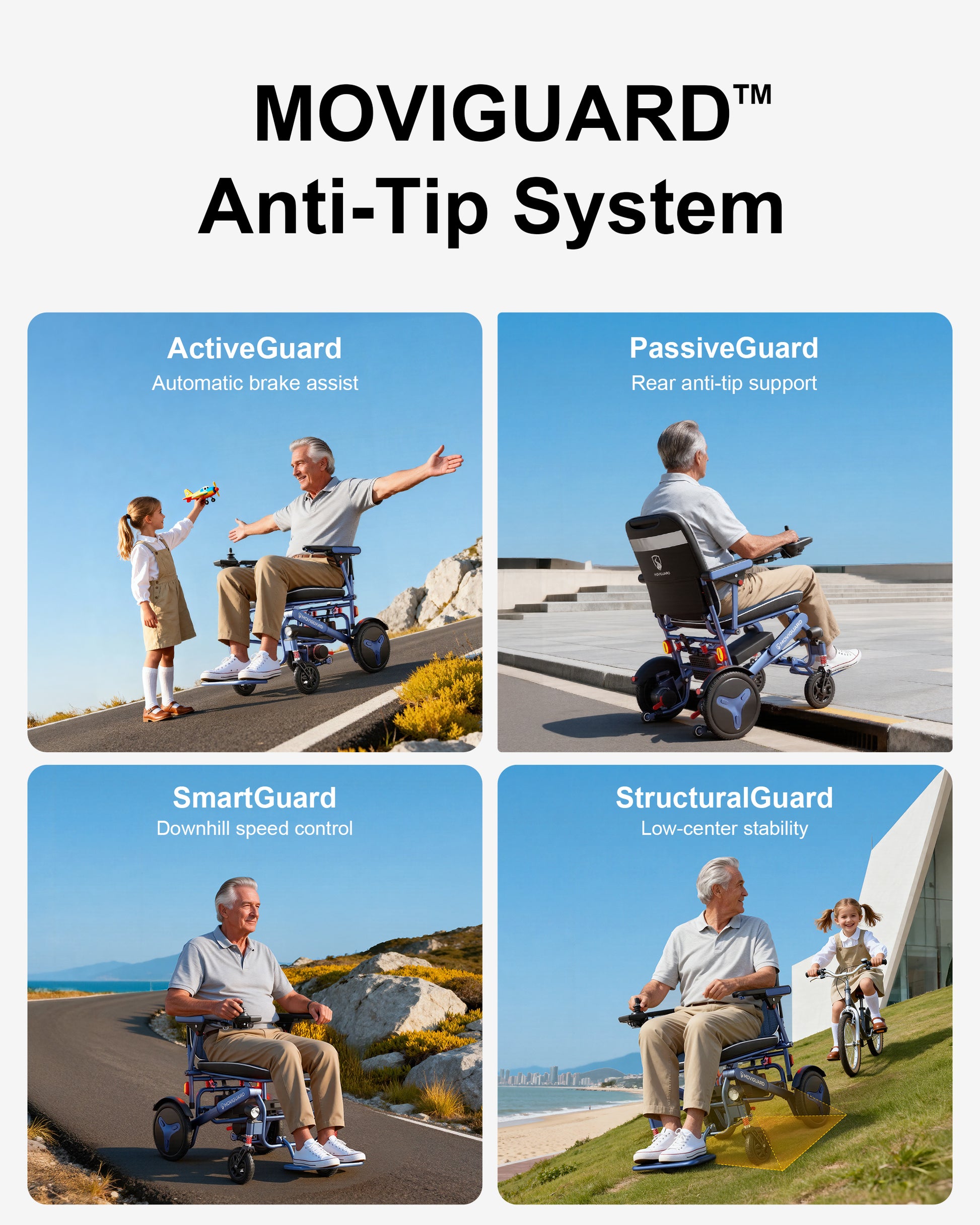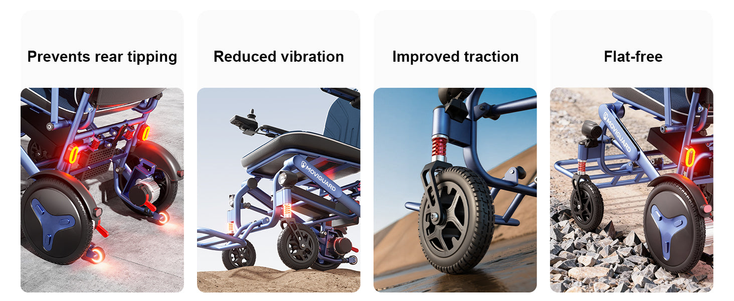【 Características de seguridad que mantienen cada movimiento estable 】Construido con una estructura antivuelco para mayor estabilidad, un freno automático que detiene la silla cuando se suelta el joystick, luces de seguridad delanteras y traseras para mayor visibilidad y absorción de impactos que mantiene el movimiento más estable y suave en superficies irregulares.