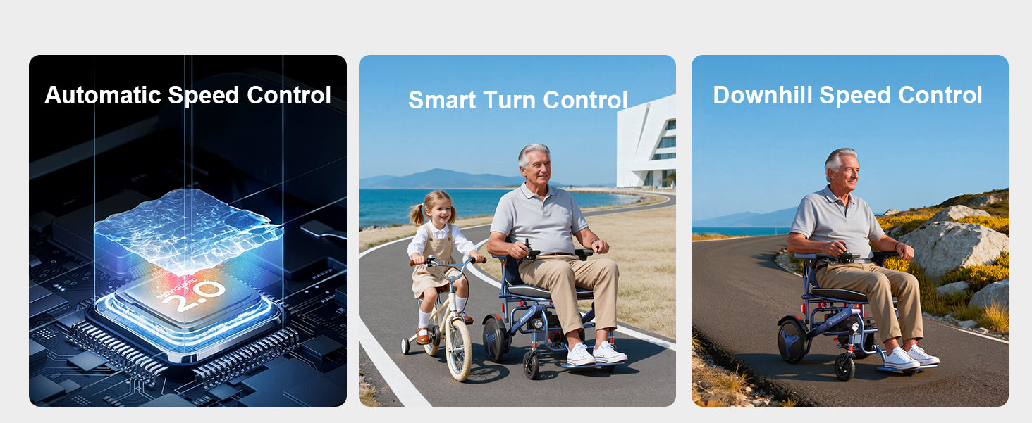 【 Control remoto cuando se necesita asistencia 】Cuenta con una operación de joystick estándar más un control remoto Bluetooth, lo que ayuda a los cuidadores o familiares a guiar la silla en espacios reducidos, ascensores, puertas y otros entornos cotidianos donde el control remoto es útil.